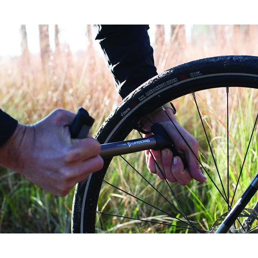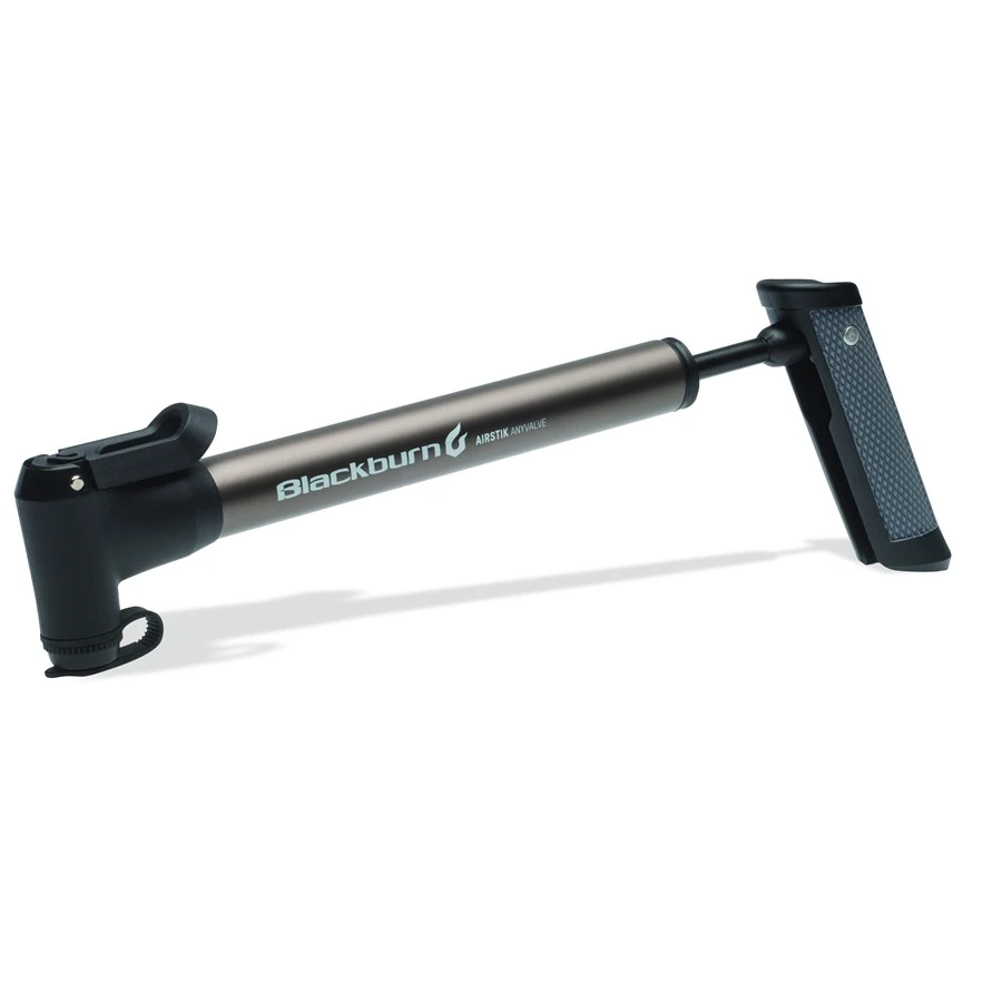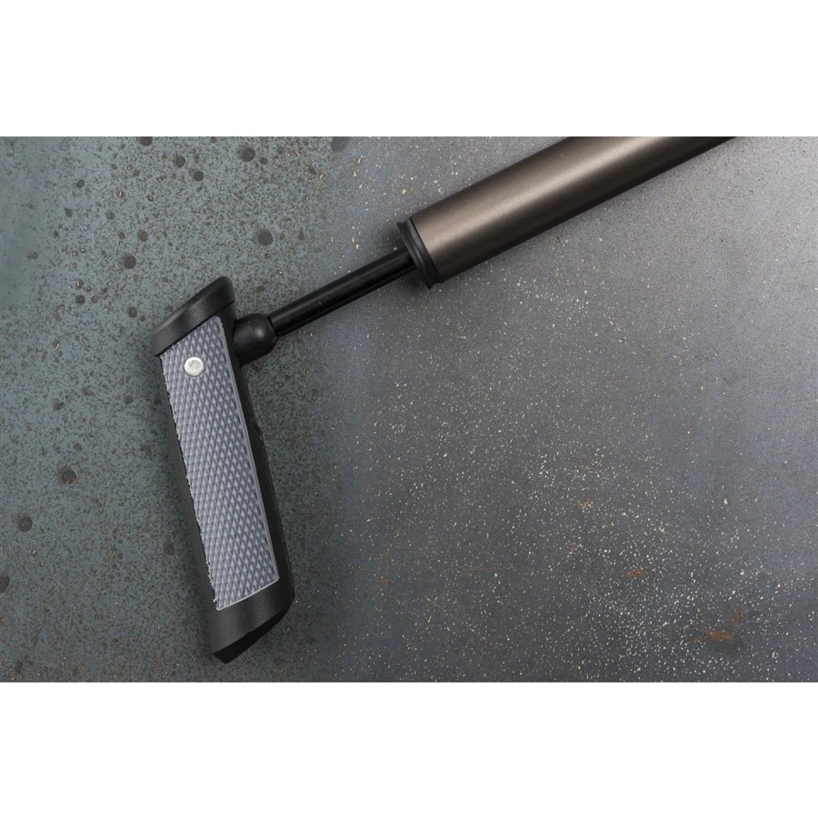 Dural mini pump, whose Anyvalve head adapts automatically to any valve. The two-stroke mechanism pumps in both directions. Pressure 160 psi / 11 bar, material Al, weight 137g.