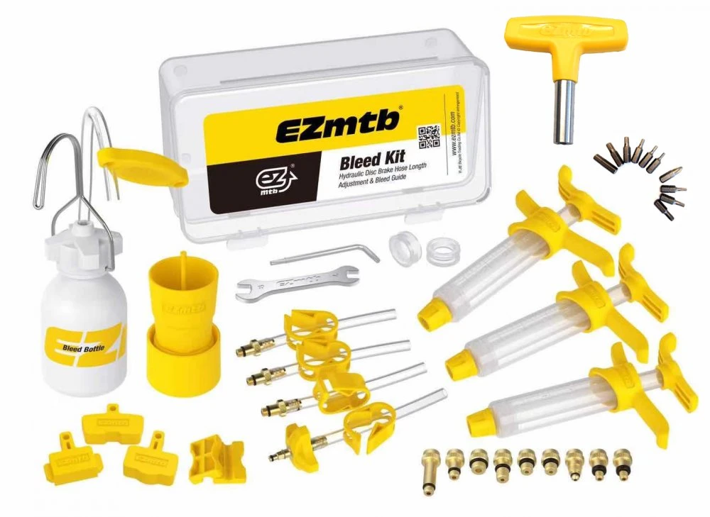 The package contains: 3x filling syringe (+ 2 spare sealing O-rings), a set of 11 brass adapters for filling all types of brakes, an overflow container for fluid, adapters for the syringe including a silicone tube and a stopper, 4 pcs of silicone tubing, a venting container for Shimano, side key 7/8mm, torx T10 and T15, collet for installing hydraulic terminals, 3 pcs.insert between brake pistons, socket wrench for bits, bits: Phillips screwdriver PH2, TORX T10/T15/T25, Allen keys: 2/2.5/3/4/5/6