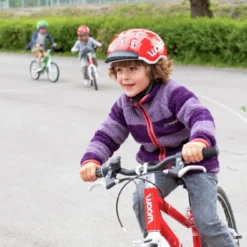 Woom children’s bicycle helmet with extended protection of the back of the head and a magnetic Fidlock buckle.