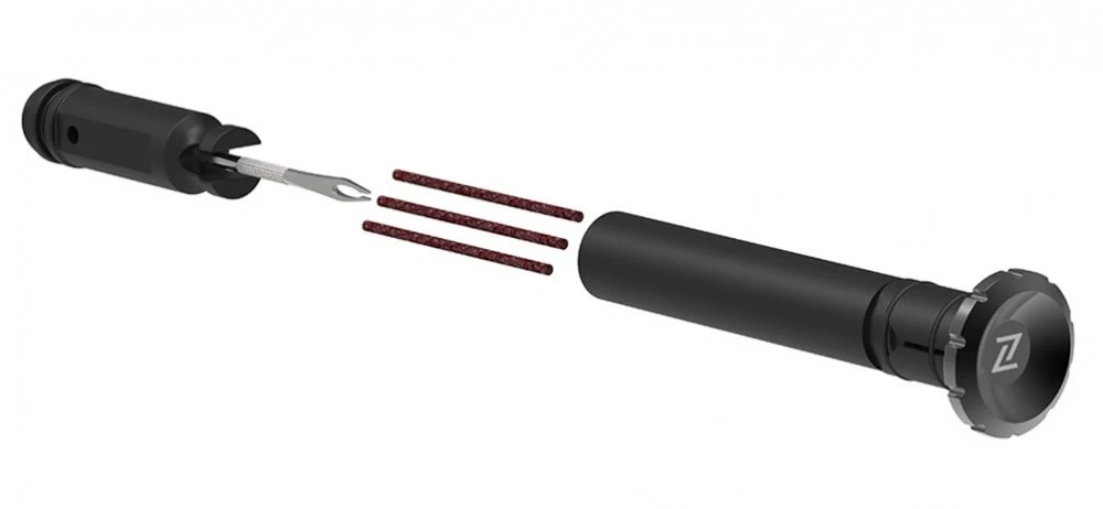 Tubeless tire repair kit with ingenious storage inside the handlebars.